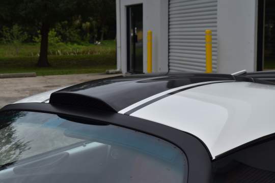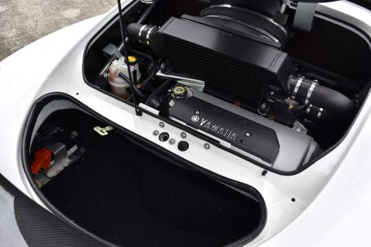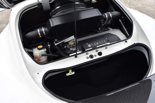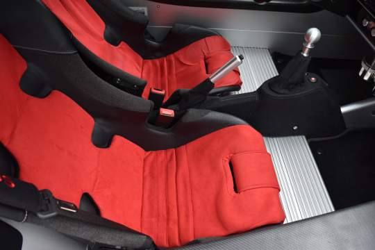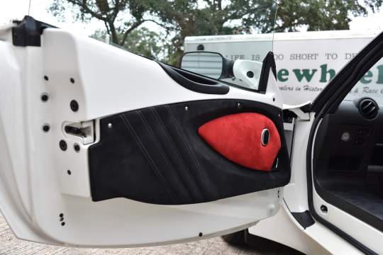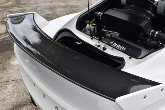 Factory equipped with carbon fiber roof, rear hatch, rear wing, splitter, seats, and interior trim